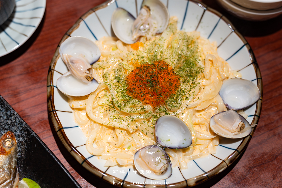 上桌後將上層的明太子拌入奶油烏龍麵中享用,多了一層明太子的獨特鹹香,搭配大顆鮮味飽滿的蛤蜊,相當好吃。