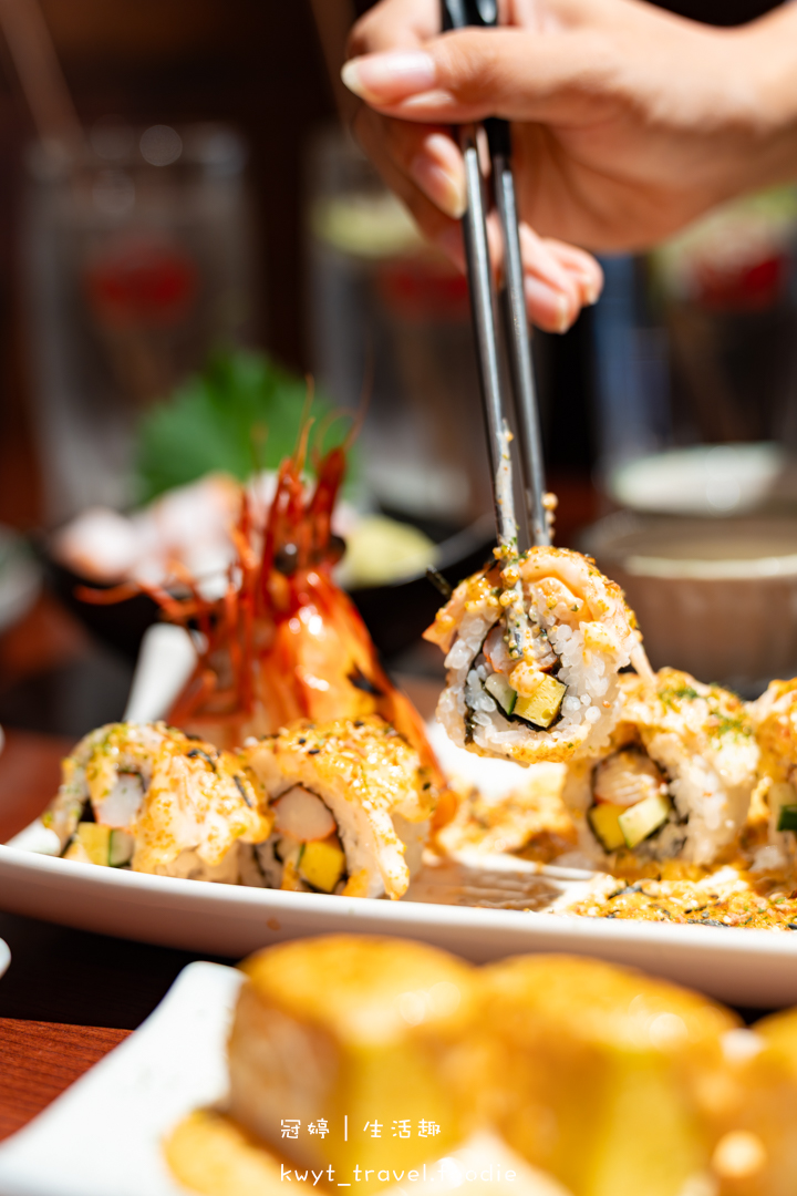 壽司卷上鋪著大塊且份量十足、香甜彈牙的海蝦肉,搭配包入玉子燒、小黃瓜等清爽配料的花壽司捲,一口一個好滿足。
