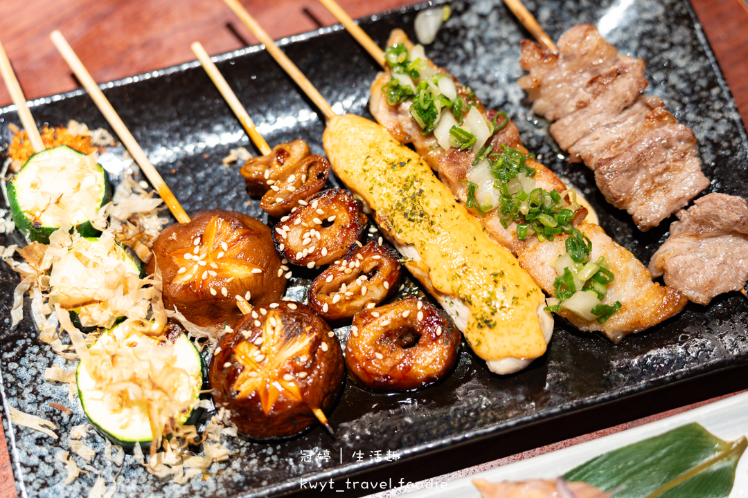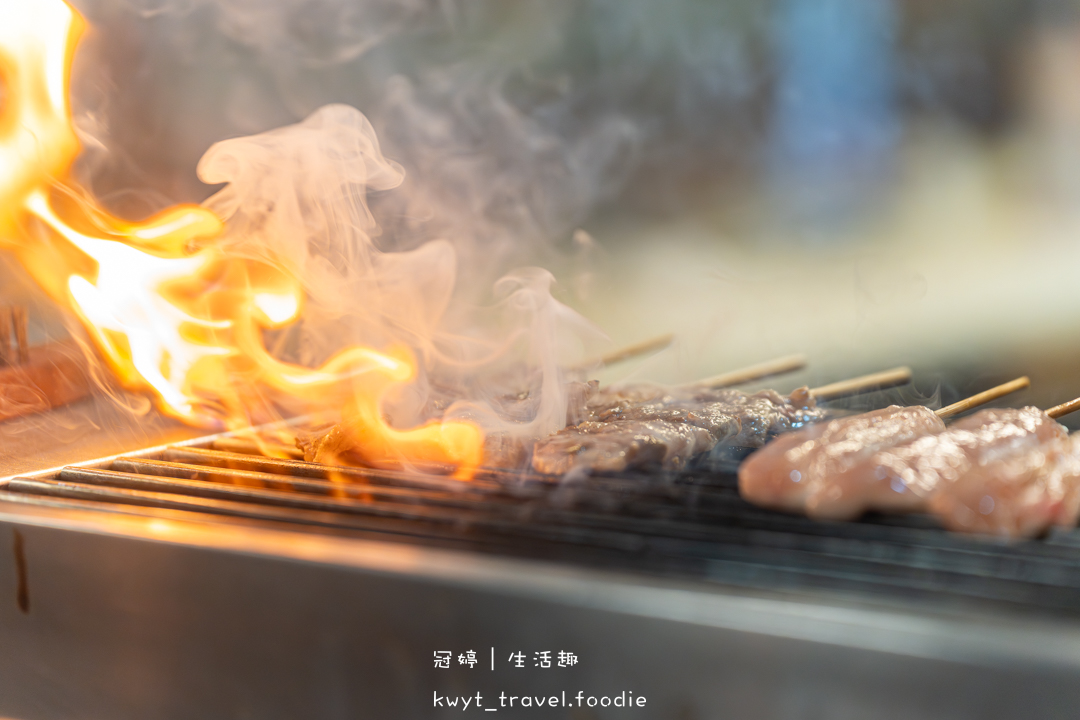 直火炭烤串燒推薦必點:脆皮雞腿串燒、明太子桂丁土雞菲力串燒、無骨牛小排串燒、炙烤鹽蔥牛舌、時蔬串燒。