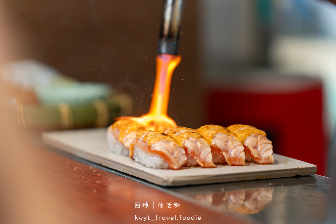 油脂豐富的鮭魚肚經過炙燒後,豐厚油脂會被完全釋放的炙燒鮭魚肚握,入口綿密、香氣十足,帶有濃郁的魚油香氣。