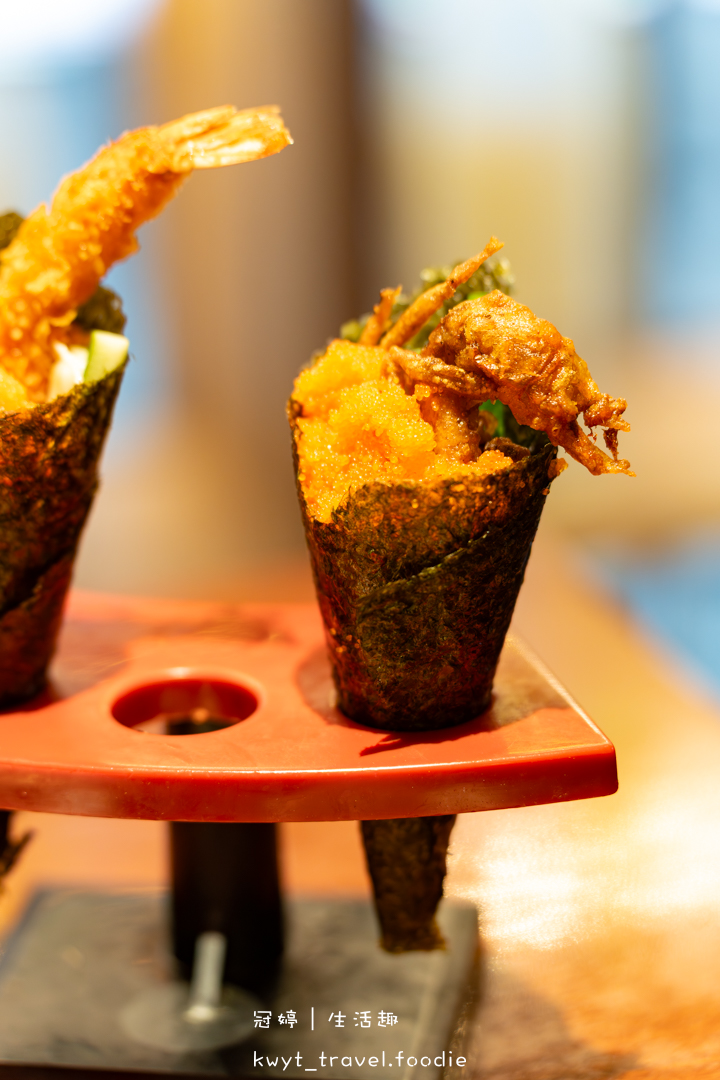 不同於常見的蘆筍或蝦子手捲,包入半隻軟殼蟹,吃起來沒有硬殼感,口感層次豐富。