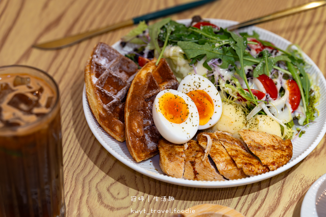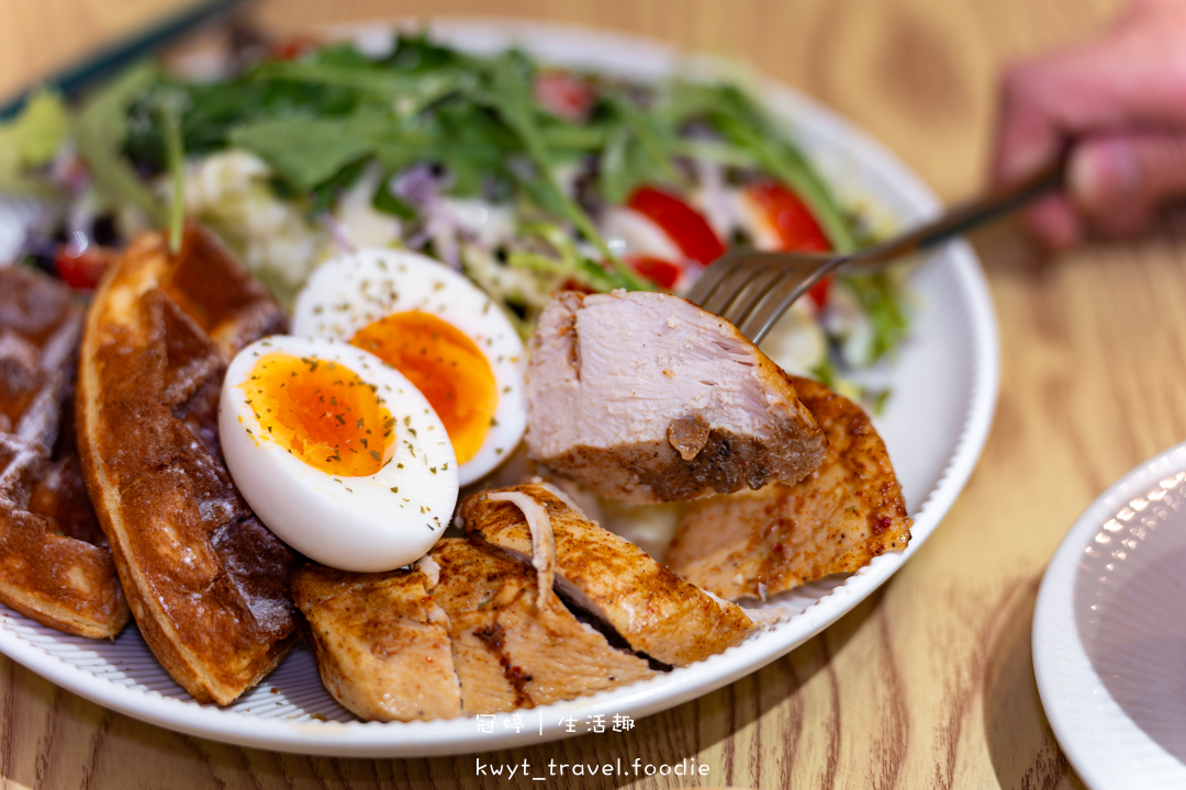 內容有半份現烤鬆餅,搭配一份坦都里烤雞胸肉、一顆半熟蛋、一球薯泥,與一份繽紛的蔬菜沙拉等豐富配菜,呈現這盤視覺與味覺都滿分的豐盛早午餐。