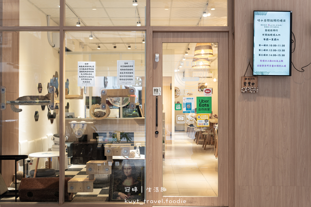 古舕咖啡三重同安店的門口有放置螢幕顯示預約制貓咪包廂開放的時間,提供給路過、想跟貓咪互動的朋友們參考。
