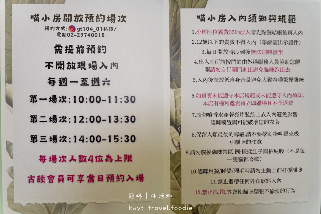 預約制貓咪包廂用餐時間90分鐘,每場次上限4位,每人低消350元。