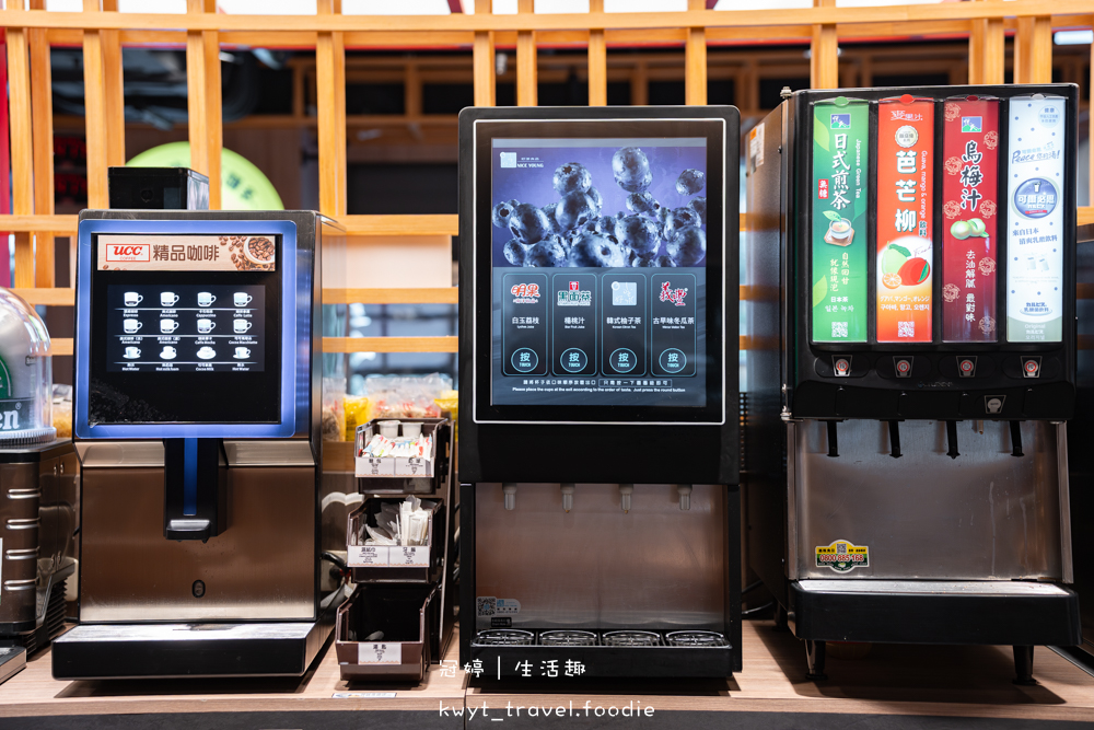 10種熱飲的咖啡機;明果白玉荔枝、黑面蔡楊桃汁、韓式柚子茶、義豐古早味冬瓜茶;日式煎茶、芭芒柳、烏梅汁、可爾必思。