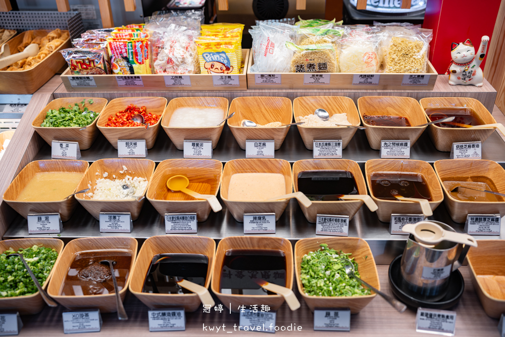 多達近20種的辛香料、食材與嚴選台灣、日本醬料,有:香菜、朝天椒、蘿蔔泥、白芝麻、蒜泥、洋蔥丁、蔥花、日本兵庫縣三溫糖、肉之間椒麻醬、烘焙芝麻香油、日本愛知縣純釀造白菊醋、辣腐乳、和風柚子醬、特濃醇厚芝麻醬、XO沙茶醬、中式釀造醬油等,均有多國語言翻譯的名稱方便取用醬料時參考,貼心加分!