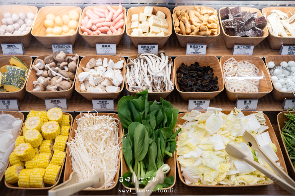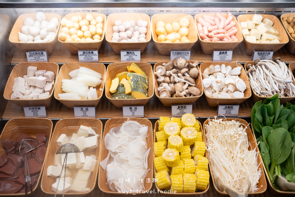 鴨肉丸、日式龍蝦沙拉包、鑫鑫腸、海綿凍豆腐、基隆甜不辣、手工米血糕、鮮豆包、鳥蛋、南瓜、白蘿蔔、空心菜、鮮香菇、杏鮑菇、精靈菇、野生雲耳、蓮藕、甜玉米、金針菇、青江菜、大白菜、高麗菜。