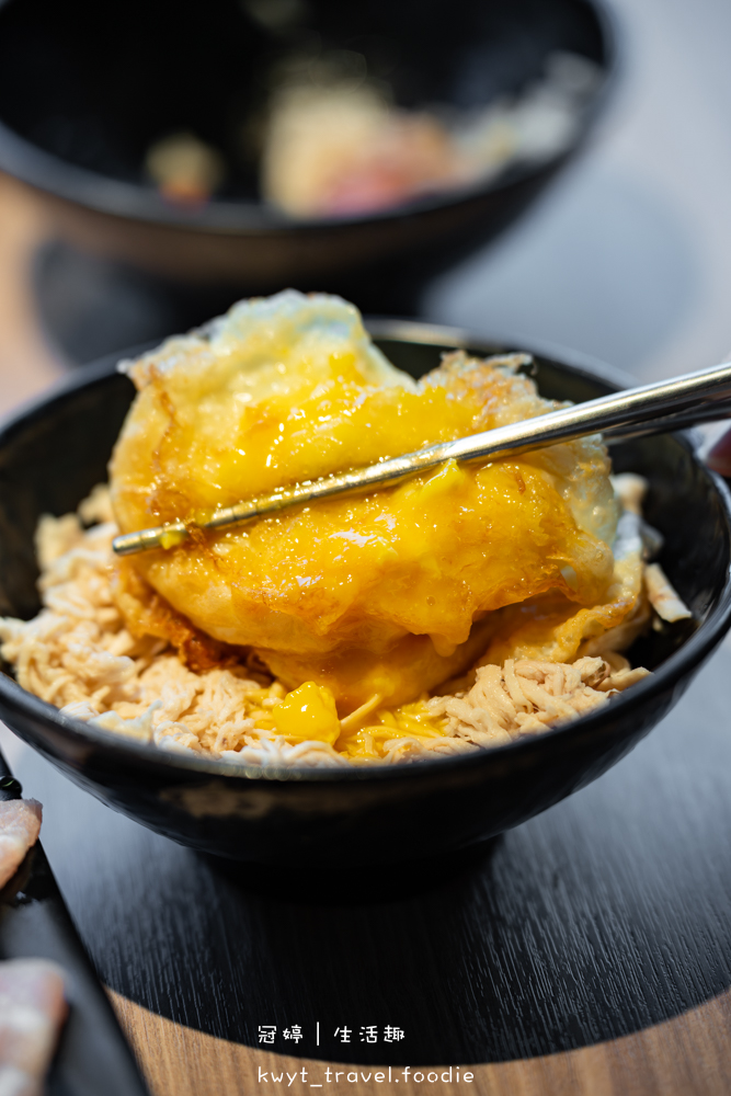 把半熟麻油炸蛋的蛋黃拌入白飯中,仔細品嚐鹹香雞汁、馥郁蛋香、雞肉鮮香、白飯甜香逐層堆疊、層次豐富的好滋味。