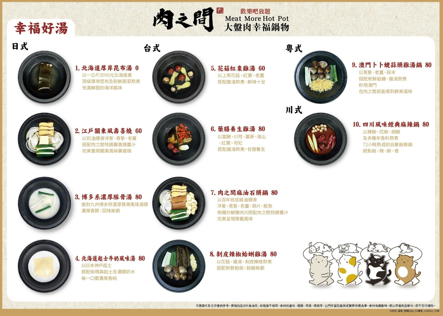 北海道厚岸昆布湯、江戶關東風壽喜燒、博多系濃厚豚骨湯、北海道起士牛奶風味湯、花菇紅棗雞湯、藥膳養生雞湯、肉之間麻油石頭鍋、剝皮辣椒蛤蜊雞湯、澳門卜卜蜆蒜頭雞湯鍋、四川風味經典麻辣鍋。