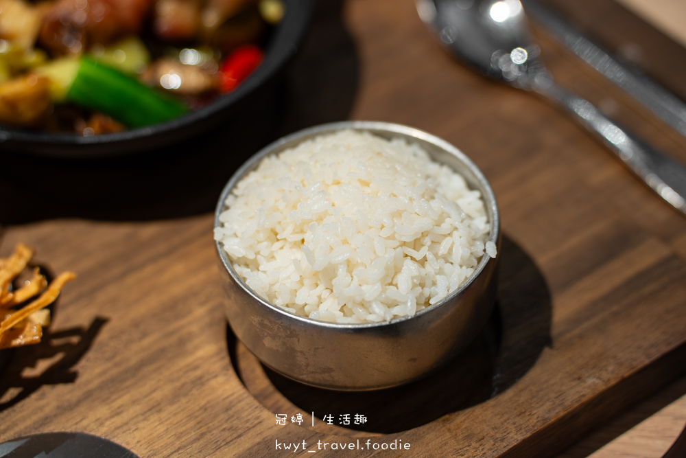完美水米比例的香Q白飯,配鹹香夠味的花雕雞煲一起吃很讚。