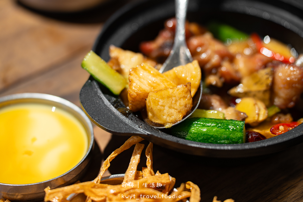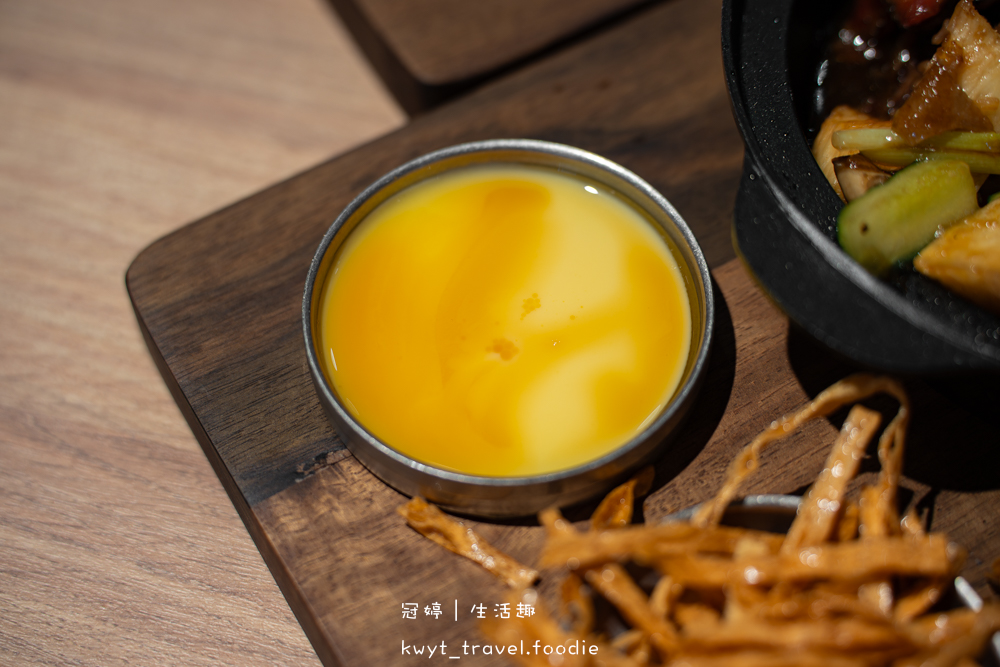 每份現點現做港式雞煲都有搭配:炸魚酥、雞蛋布丁、古法菊花茶、白飯,製作成個人套餐的形式出餐。
