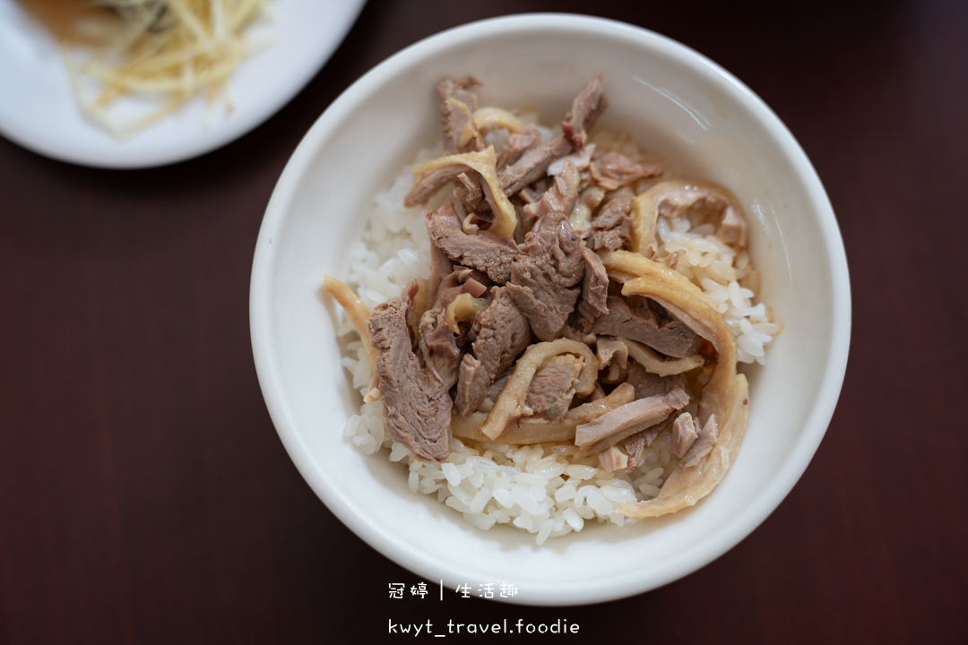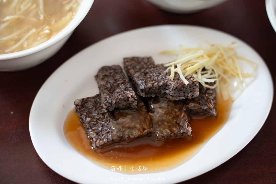 手工製作的鴨米血,搭配特製醬汁、薑絲入口,口感十分軟嫩、不乾硬,配著鴨肉羹、鴨肉飯一起享用,很讚。