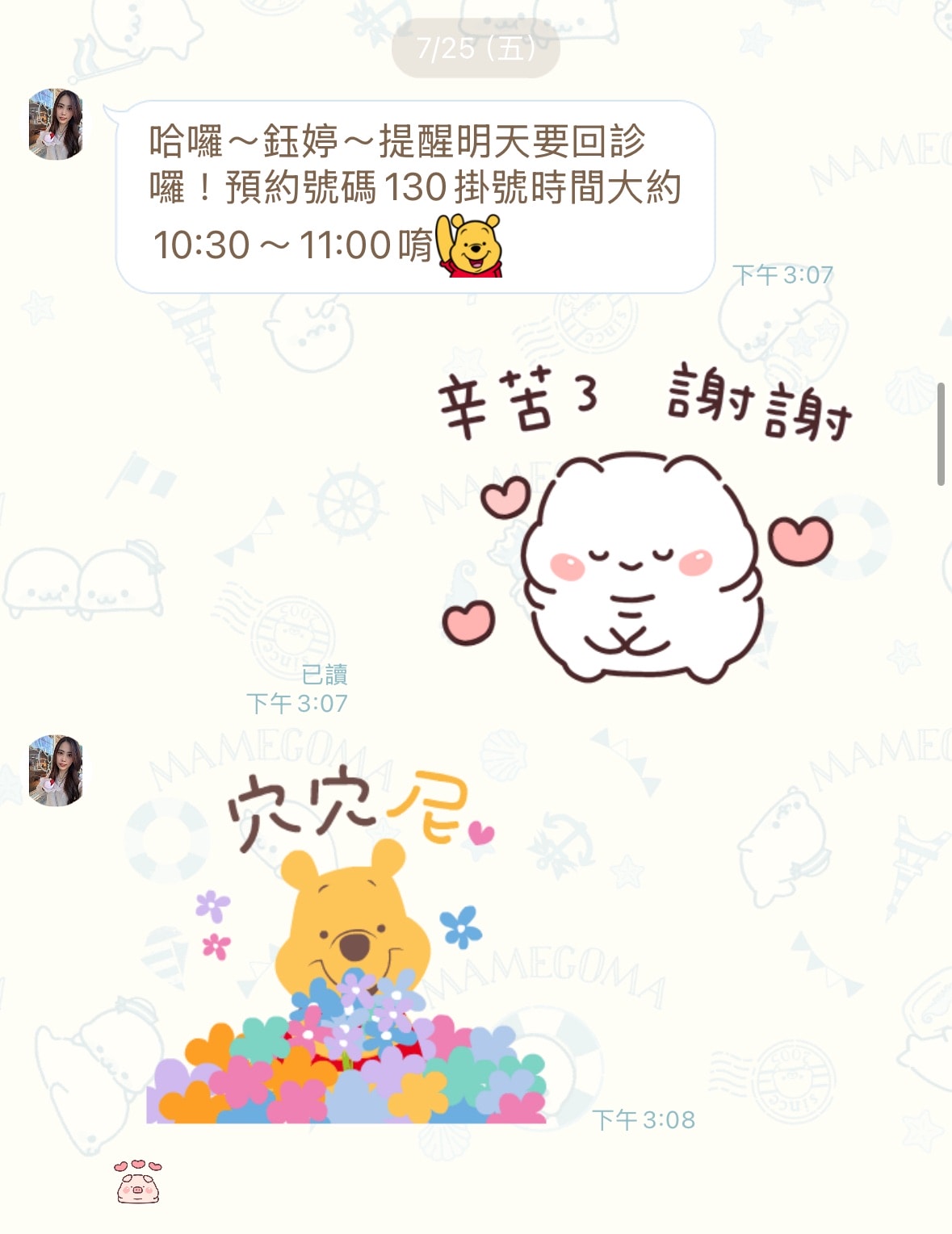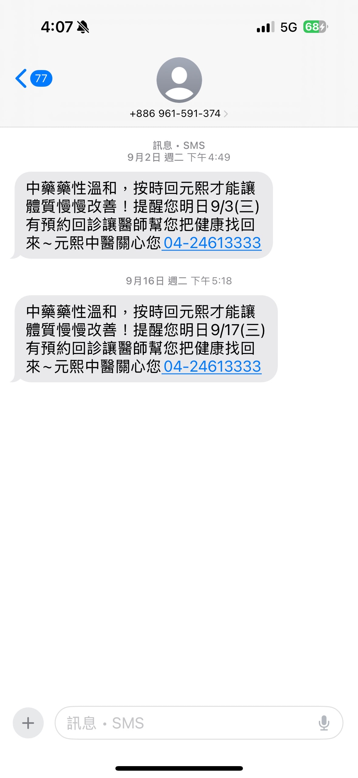 初診時填寫資料表會詢問是否同意接收簡訊通知,同意的話會在每次回診前一天寄送簡訊提醒。